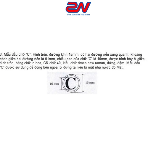 Hình tròn, đường kính 15mm, có hai đường viền xung quanh, khoảng cách giữa hai đường viền là 01mm, chiều cao của chữ “C” là 10mm, được trình bày ở giữa hình tròn, bằng chữ in hoa, cỡ chữ 40, kiểu chữ times new roman, đứng, đậm. Mẫu dấu “C” được sử dụng để đóng bên ngoài bì đựng tài liệu mức độ Tối Mật.